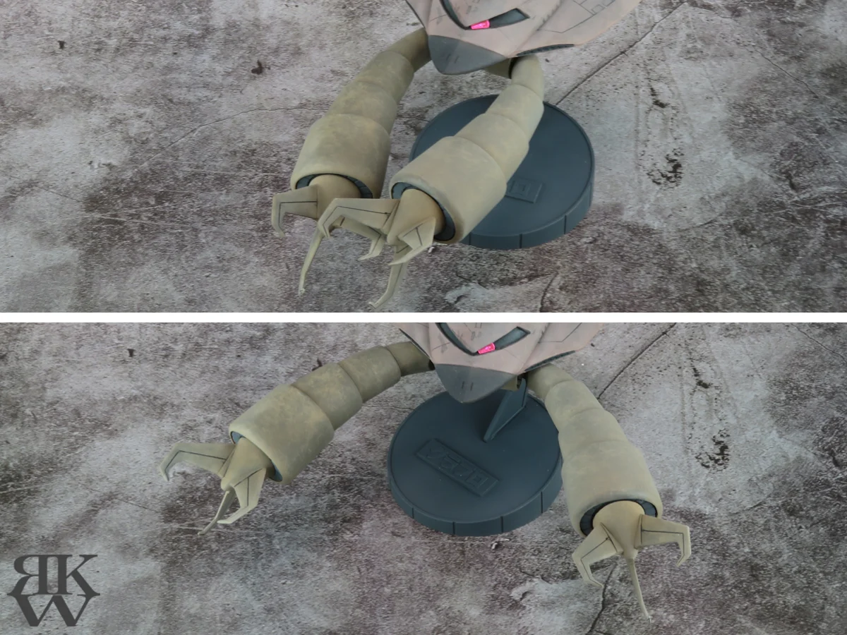 - 画像左上の、クロー基部の黒に塗装するダクト状のパーツ(パーツNo.12)は、本来はドーナツ状をしている。